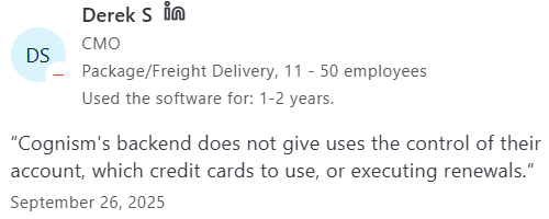 — Derek S., CMO, Package/Freight Delivery (Source: Capterra Review)