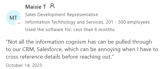 - Pricing & Contract Friction: Cognism requires high-ticket annual contracts (often starting around $15,000/year). Users frequently complain about rigid auto-renewals and a lack of backend administrative control over billing.