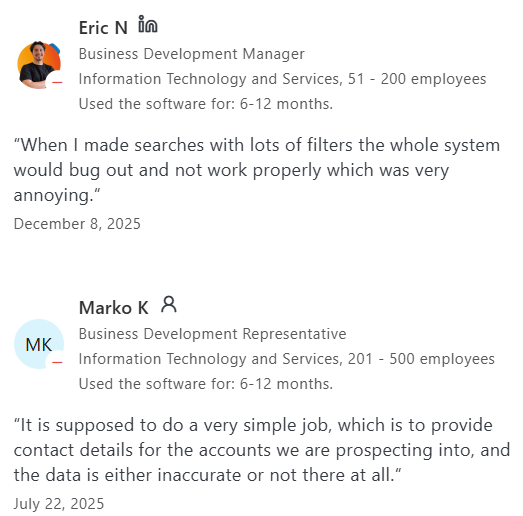 - Regional Data Gaps: While US data is strong, users frequently complain that finding accurate, verified phone numbers for clients outside North America is highly difficult.
