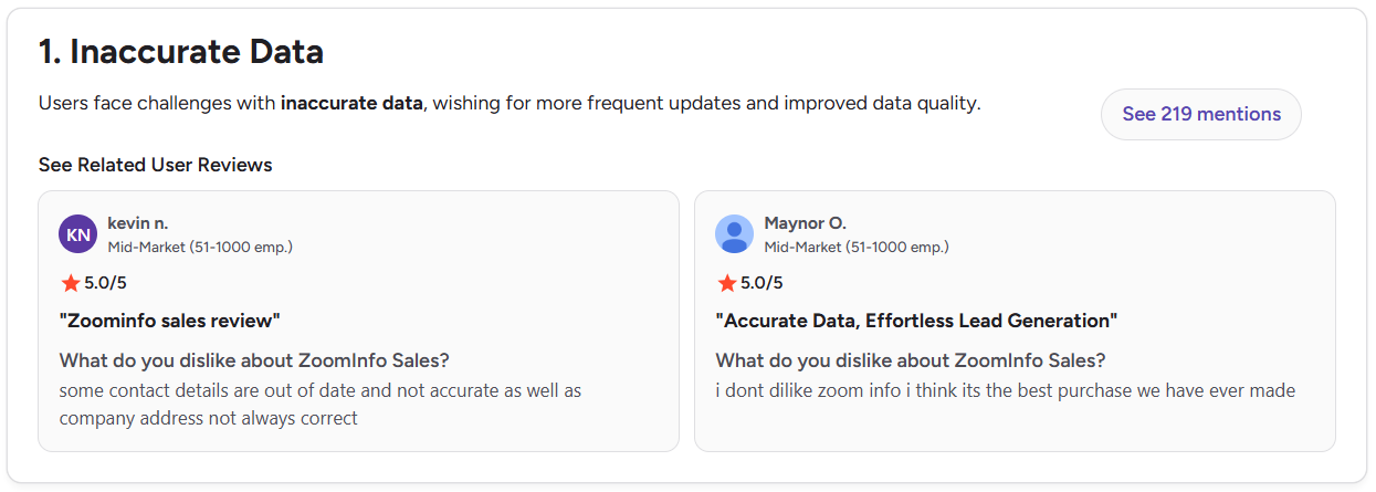 “Inaccurate intent signals and high costs.” "ZoomInfo is a powerful platform, but it’s important to note that data accuracy can sometimes be inconsistent... The intent and WebSights features leave a bit to be desired with accuracy. For the premium price, we expected more than just 'company-level' hits that don't tell us who is actually visiting." — Verified G2 Review